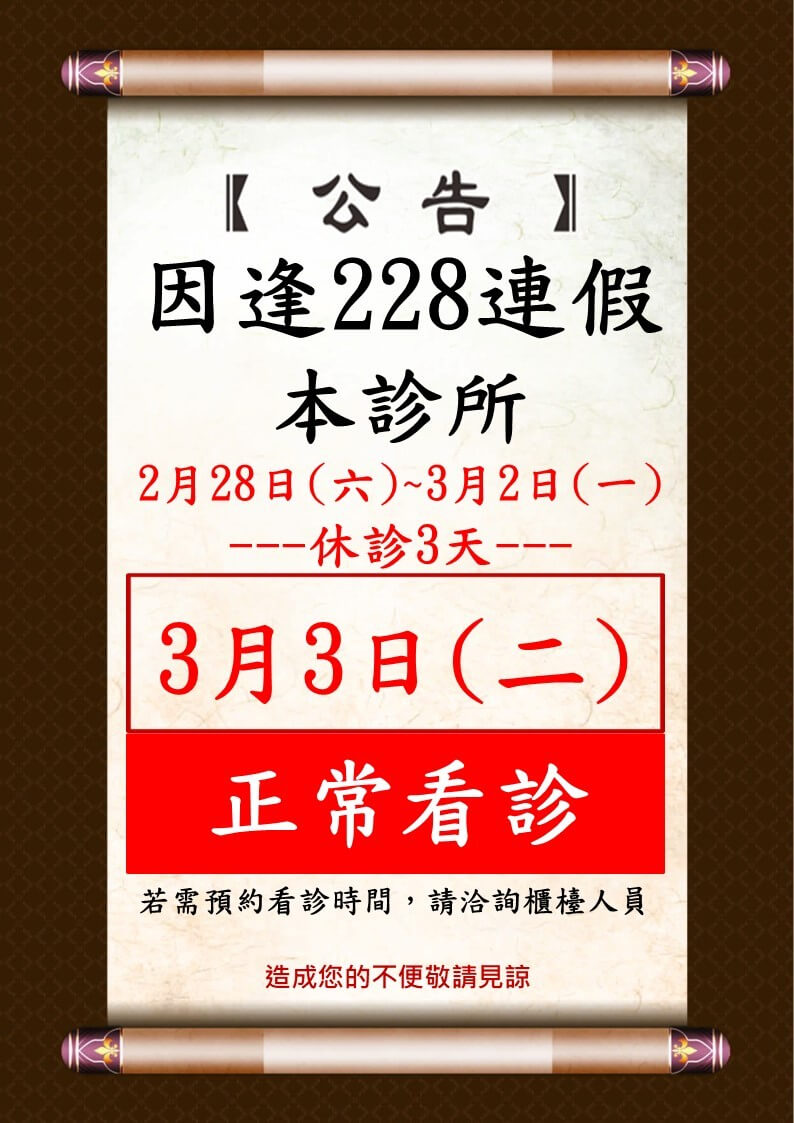 2月28日(六)~3月2日(一)休診三天