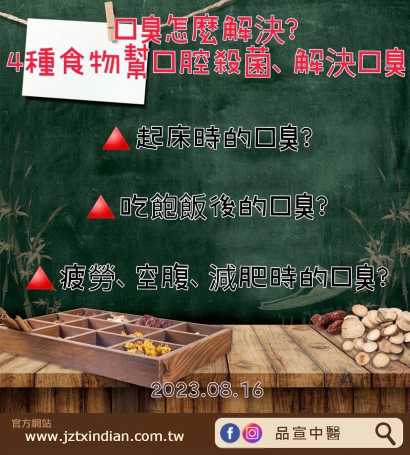- 吃飽飯後的口臭-飯後含少量的水在口中,上下左右活動舌頭,溶出留在舌頭上的食物殘渣後吐掉,再喝一杯水,會發現新分泌出來的唾液變得新鮮。