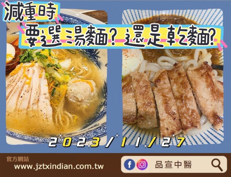 正在減重的人建議選擇吃「湯麵」,乾麵和湯麵的重點差別在油脂的部分;因為湯麵所有的油都在湯頭裡面,所以如果點了湯麵,記得吃麵和料就好。