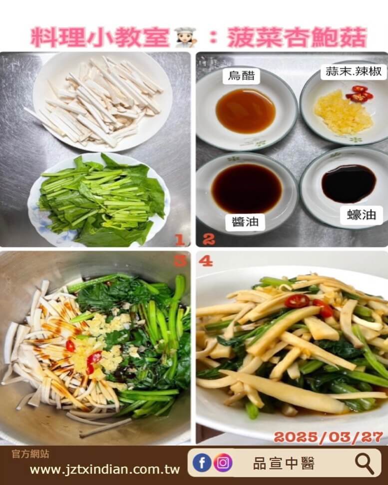 1.將杏鮑菇切成條,菠菜切段